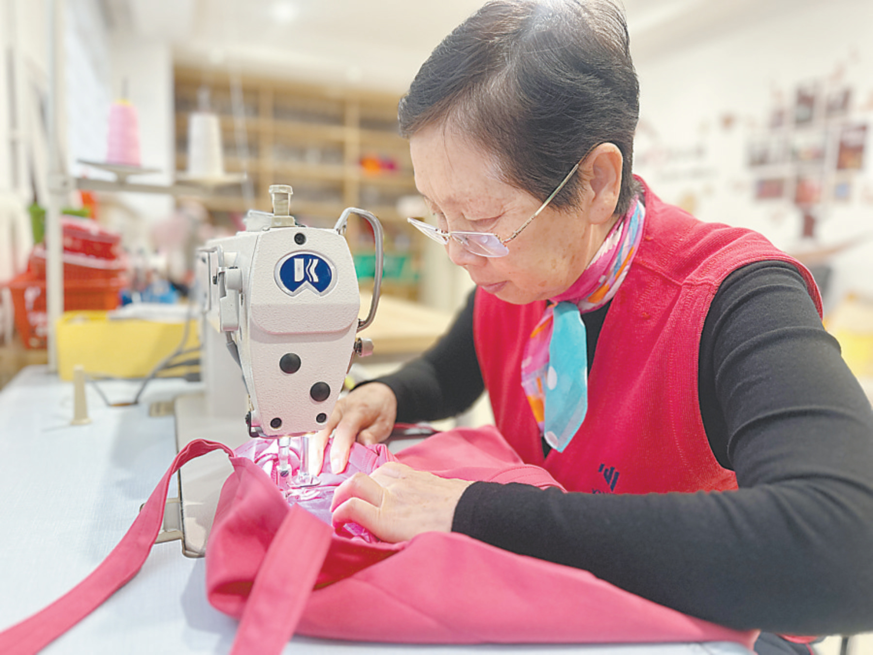 架子上還擺著不少布袋子,有牛仔布的,有純色布的,這些全是邱英梅用舊衣服改造的。“舊衣物再利用,既環保又節約,大家用著也喜歡。”正說著,兩位老人拎著布包走進來,笑著跟邱英梅打招呼,她們手里的包正是出自邱英梅之手。“邱姐手工好、心更善,她做的東西我們都愛用,有她在,社區里處處充滿暖意。”居民們的評價,是對她最好的認可。