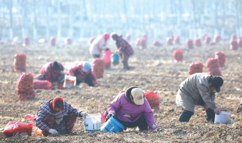12月6日,河南省焦作市溫縣黃河街道東張王莊村農民在田間收獲懷地黃。