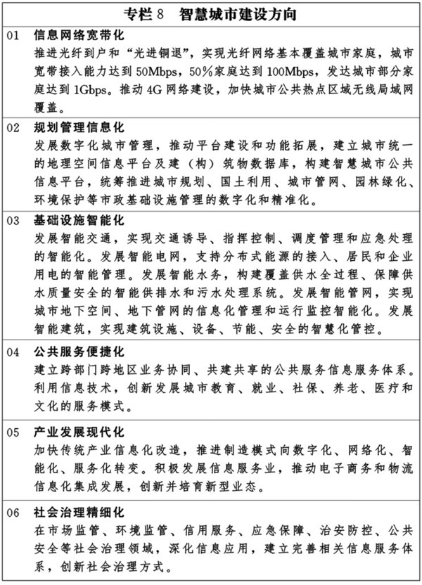 統(tǒng)籌城市發(fā)展的物質(zhì)資源、信息資源和智力資源利用,推動物聯(lián)網(wǎng)、云計算、大數(shù)據(jù)等新一代信息技術(shù)創(chuàng)新應用,實現(xiàn)與城市經(jīng)濟社會發(fā)展深度融合。強化信息網(wǎng)絡、數(shù)據(jù)中心等信息基礎設施建設。促進跨部門、跨行業(yè)、跨地區(qū)的政務信息共享和業(yè)務協(xié)同,強化信息資源社會化開發(fā)利用,推廣智慧化信息應用和新型信息服務,促進城市規(guī)劃管理信息化、基礎設施智能化、公共服務便捷化、產(chǎn)業(yè)發(fā)展現(xiàn)代化、社會治理精細化。增強城市要害信息系統(tǒng)和關(guān)鍵信息資源的安全保障能力。