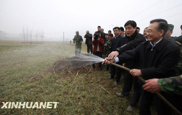 這是2月7日,溫家寶在禹州市鴻暢鎮(zhèn)東高村的麥田里,拿起塑料水管為麥田澆水。新華社記者 姚大偉 攝