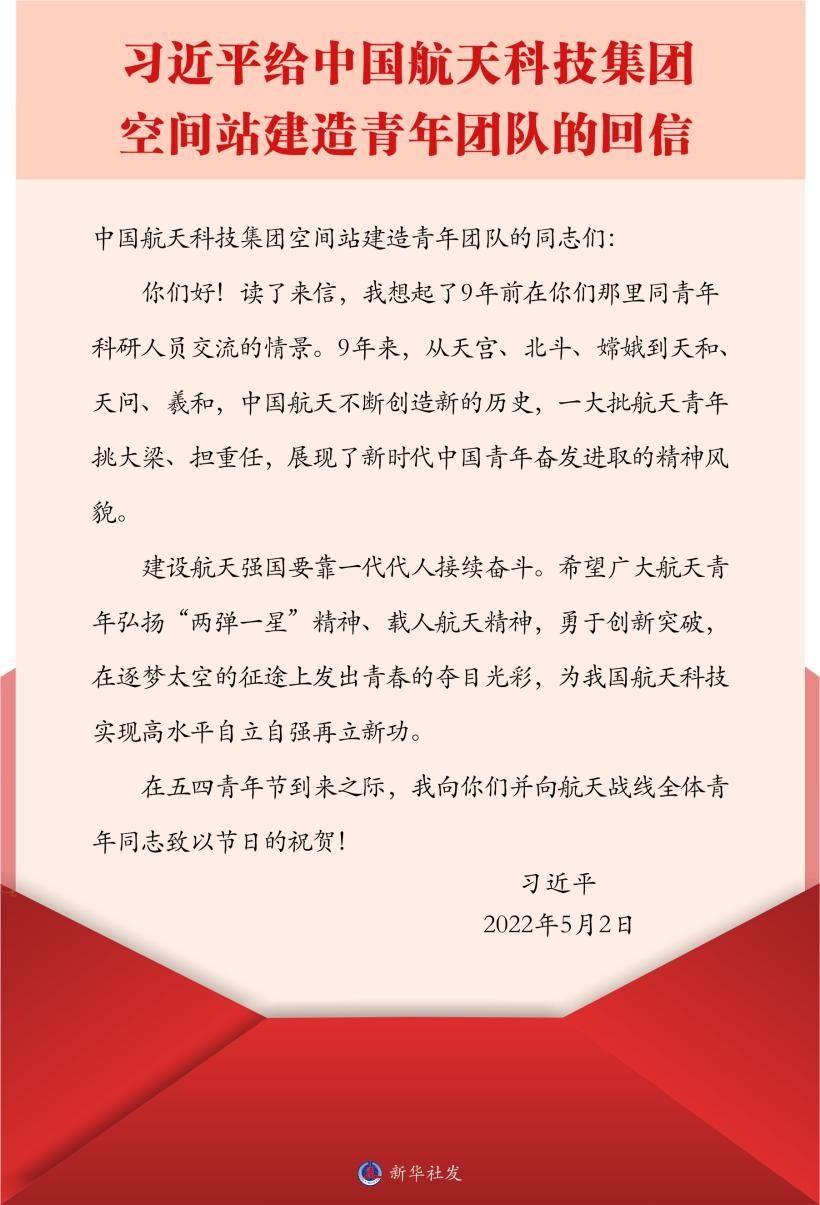 “讀了來信,我想起了9年前在你們那里同青年科研人員交流的情景。9年來,從天宮、北斗、嫦娥到天和、天問、羲和,中國航天不斷創造新的歷史,一大批航天青年挑大梁、擔重任,展現了新時代中國青年奮發進取的精神風貌。”習近平總書記在回信中勉勵廣大航天青年勇于創新突破,在逐夢太空的征途上發出青春的奪目光彩。